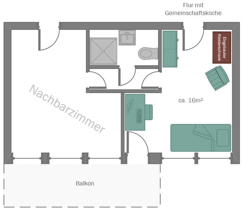Die Zimmer sind ca. 13 m groß und besitzen eine Einbauschrank. Das Bad mit Dusche wird immer mit einem Mitbewohner geteilt. Einige Zimmer haben Zugang zu einem der Balkone. Auf Wunsch kann eine Teilmöbilierung (Bett, Schreibtisch) gestellt werden.